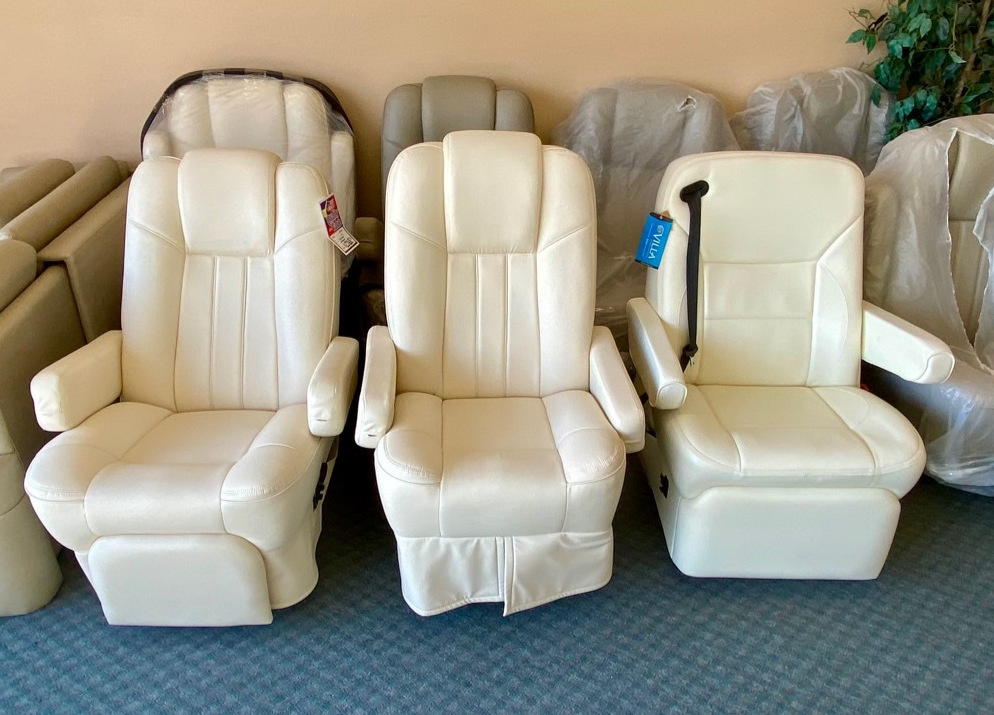 Our showroom boasts a diverse range of recliners, loveseats, theater groups, sofas, driver & passenger (captain) seats, and more—all ready for you to experience firsthand. Discover a world of possibilities as you explore our vast inventory of RV furniture, meticulously curated to transform your RV into a cozy haven.